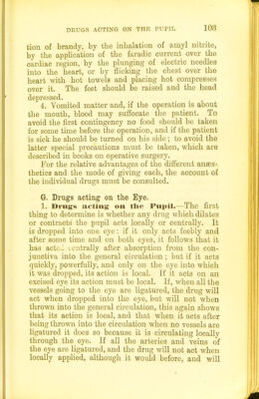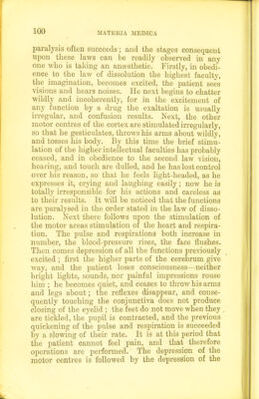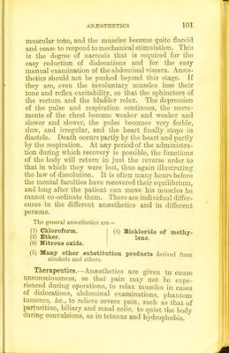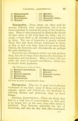 ![(6) Chloralamicle. ] (10) Alcohol. (7) Siilphonal. (11) Hyoscine. (8) Paraldehyde. (12) Cannabis iudica. (9) Trional. (13) Lupulus. Therapeutics.—These drugs are often used for persons suffering from sleeplessness, but it is far more important to remove the cause of the sleepless- ness. Sleep is often promoted by dilating the vessels of other parts of the body than the brain; for ex- ample, a warm bath or an abundant meal conduces to sleep. The use of hypnotics is greatly abused. Those who take them become habituated to them, so that at last even large doses do not cause sleep. Chloral, the bromides, and chloralamide are perhaps the most satisfactory. Narcotics are substances which not only produce sleep, but also in large doses depress the fmictions of respiration and circulation. Many of them fall also under the head of general anaesthetics; others are, in smaller doses, hypnotics. The following is a list of them : (1) General anaesthetics. (6) Hyoscyamus. (2) Opium. (7) Alcohol. (3) Chloral hydrate. (8) Cannabis indica. (4) Belladonna. (9) Lupulus. (5) Stramonium. All must be given in considerable doses. Therapeutics.—They are of great use in calming excitement of any kind; many of them, such as, for example, opium and belladonna, are beneficial in rehevuag distress and producing sleep in heart disease. General Anesthetics.—These are drugs that lead to a total loss of consciousness, so that pain IS no longer felt; at the same time reflex action is abohshed. They illustrate admirably the law of dissolution, and also the fact that after excitement H 2](https://iiif.wellcomecollection.org/image/b21507260_0121.jp2/full/800%2C/0/default.jpg)