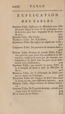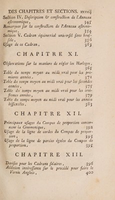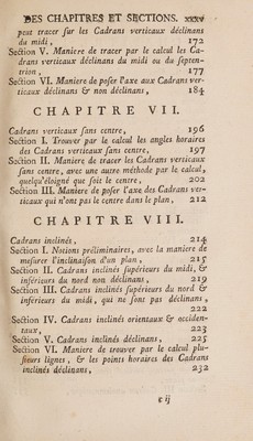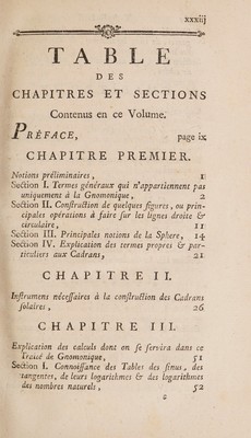 ![: XXXH] P TABLE D ES _CHAPITRES ET SECTIONS à | : Ca en ce Volume: Prsrace, | | page ix _ CHAPITRE PREMIER. Notions préliminaires, À Section L. Termes généraux qui n’appartiennent pas _ uniquement à la Gnomonique, 2 Section ÎL. Conffruttion de quelques fioures , ou prin- cipales opérations & faire fur les lignes droite & circulaire, II Section ÎIT. Principales notions de la Sphere, 14 Section ÎV. Explication des termes propres & par- ticuliers aux Cadrans, 21; CH APERPRE IT Inffrumens néceffaires à la conflruélion des Cadrans folaires , : 26 et PET OR ET EL Explication des calculs dont on fe fervira dans ce Traiié de Gnomonique, fi Se&ion [, Connoiffance des Tables des finus, des tangentes, de leurs logarithmes & des logarithmes des nombres naturels , 52 7](https://iiif.wellcomecollection.org/image/b28767743_0037.jp2/full/800%2C/0/default.jpg)