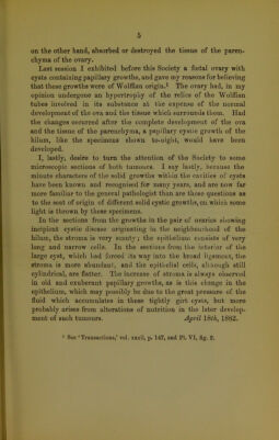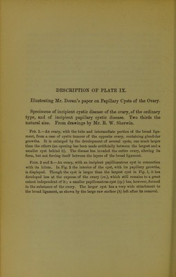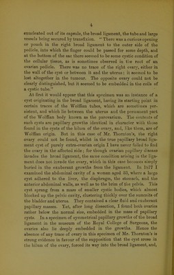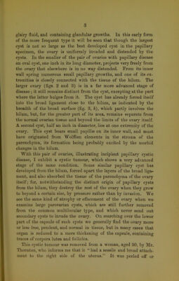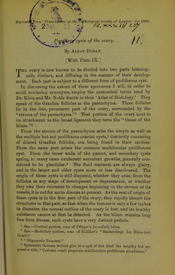 ![SeprintMjrom ‘ Transactions of the Vatholoyical Society of London ’for 1882, *£> on. A*- fU( xxx/// J Ptyylka^cysts of the ovary. By Alban Doran. ' Jtoy // [With Plate IX.] The ovary is now known to be divided into two parts histologi- cally distinct, and differing in the manner of their develop- ment. Each part is subject to a different form of proliferous cyst. In discussing the nature of these specimens I will, in order to avoid confusing synonyms, employ the anatomical terms used by Dr. Klein and Mr. Noble Smith in their ‘Atlas of Histology.’ They speak of the Graafian follicles as the parenchyma. These follicles lie in the free, prominent part of the ovary, surrounded by the “ stroma of the parenchyma.”1 That portion of the ovary next to its attachment to the broad ligament they term the “ tissue of the hilum.”2 From the stroma of the parenchyma arise the simple as well as the multiple but not proliferous ovarian cysts,3 distinctly consisting of dilated Graafian follicles, ova being found in their cavities. From the same part arises the common multilocular proliferous cyst. From the inner walls of the parent, and secondary cysts spring, in many cases exuberant succulent growths, generally con- sidered to be glandular.4 The fluid contents are always glairy, and in the larger and older cysts more or less discoloured. The origin of these cysts is still disputed, whether they arise from the follicles at any stage of development or degeneration, or whether they owe their existence to changes beginning in the stroma or its vessels, it is not for me to discuss at present. As the seat of origin of these cysts is in the free part of the ovary, they rapidly absorb the structures in that part, so that when the tumour is only a few inches in diameter, the normal outline of the ovary is lost, and its healthy substance cannot at first be detected. As the hilum remains long free from disease, such cysts have a very distinct pedicle. 1 Syn.—Cortical portion, zone of Pfliiger’s (so-called) tubes. 3 %».—Medullary portion, zone of Kolliker’s “ Markstriinge des Hilus (sic) Ovarii.” 3 “ Oligocystic Tumours.” 4 Systematic German writers give to a cyst of this kind the lengthy but ex- pressive title, “ Cystoma ovarii proprium multiloculare proliferum glandulare.”](https://iiif.wellcomecollection.org/image/b22456703_0003.jp2/full/800%2C/0/default.jpg)
