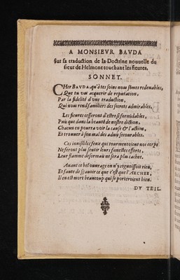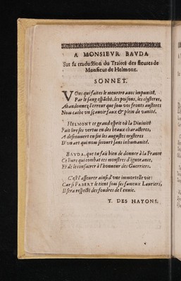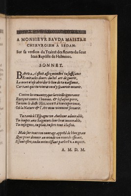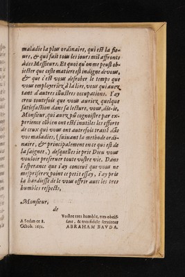 ![maladie la plus ordinaire, qui ef la fiea are, G° qui fait tous les jours mil affronts As$es Meffieurs, Et quoi qu'on me peuf} ob« seller que cefematiere efi indiLnie de vos, C7 que c'eft vous defrober le temps que vous employeriex à la lire, vous quiaueg, tant d'autres iluftres occupations. T'ay creu toutefois que vous auriex quelque fetisfaftion dans [a lefture, vos, dis-ie, Monfieur,quiauex p£ cognoifire par exe perience côbien ont eSlé inutiles les efforts de ceux qui vous ont autrefois traité dàs vos maladies, ([uinant la methode or di naire, C7 principalement en ce qu: ef} de La faigner,) defquelles ie prie Dies vous vouloir preferuer toute vofire vie, Dans l'efberance que d'ay conceuë quevceus ne mefpriferex point ce petit eflay, day pris la bardief]e de le vous offrir auec les tres bumbles refhefts, de Voftretres humble, ttes obeié À Sedan ce 8. fant, &tresfidele feruireug Oktob, 1652. ABRAHAM BAVDA.](https://iiif.wellcomecollection.org/image/b32990984_0013.jp2/full/800%2C/0/default.jpg)