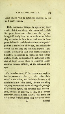 An essay on vision : briefly explaining the fabric of the eye, and the nature of vision: intended for the service of those whose eyes are weak or impaired: enabling them to form an accurate idea of the true state of their sight, the means of preserving it, together with proper rules for ascertaining when spectacles are necessary, and how to choose them without injuring the sight / by George Adams.