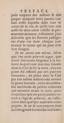 ![bon , rien d’ettimable , ni qui mé- rire d'être envié , jy con{ens vo- lontiers , parce que je comprends qu'il eft plus facile de cumpoler de gros livres pleins de mots fleu- ris, de raifonnemens fort variez, de citations nombreufes, qui en rendent la leéture agréable , que de fe renfermer dans les bornes d’un opufcule que l'on travaille avec foin, & que l’on tâche fur tout de rendre utile & profitable au public. | | Or fi mes recherches font trop peu confiderables pour procurer aux petits enfans les avantages que Jai en vüé en travaillant en leur faveur , du moins mies intentions font bonnes, ce qui eft toujours une confolation, quand ontravail- leroit inutilement pour la fin qu’on fe propofe, puifque l'on eft au moins für que n'ayant pü par tous fes foins & toute fon application , tirer des bras de la mort ces in- nocens, ils {ont par là délivrez à li]](https://iiif.wellcomecollection.org/image/b33003609_0013.jp2/full/800%2C/0/default.jpg)