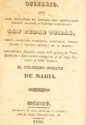 Quinario, que para implorar el amparo del portentoso virgen, doctor y martir carmelita San Pedro Tomas ... : especialisimo abogado contra todo genero de peste, epidemia, ô enfermedad contagiosa.