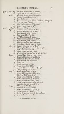 ![Apl. June July Aug. RICHMOND, SURREY. 8 Kathrine Parker dau. of Henry. ‘¢ Jos. son of In° Hobbs Son.” George Almond son of In°. Tho’ Urlin son of Hen. John Armstrong Rob'son Mackean Cawley son of M* John Cawley. Eliz. Hammon dau. of Thomas. Marg*t Upcut dau. of W™. Henry Alexander son of Rob*. Josuah Andrews son of In°. John son of John Hughes. John son of In° Taylor. W™ Dennis son of James. Amey Woodham dau. of Sam. John son of John Parker. John [blank] of John Banfield. Margarett Skinner dau. of Robert. George Kitching son of Danl. Christopher Bacon son of Christopher. W® Alcock son of W™. Anne Vicars dau. of James. W™ Andrew Arnold son of M' Andrew. Hester Ewer dau. of Henry, esq’. Emanuel Johnson son of Sam. Rebeckah dau. of Tho’ Phelp. John son of W™ Williams. Anne Cox. Mary Cole dau. of Tho’. Anne dau. of In° Hide. [ blank} Edmunds [ blank} Joseph. George Tharp son of Geo. Ruth Downs dau. of W™. Anne Whitney dau. of Edward. Rich? Myhill* son of In®. Anne dau. of Phillip Richards. Eliz. Curants dau. of Stephen. Edw! Runelson son of James. Mary Utworth dau. of M' Richard. Cathrine Barnes dau. of W™. W™ son of W™ Hawkins. W™ son of W™ “ Rumml.” Isbell Brown dau. of John, g'. John son of In° Hope. Rose Greenway dau. of Marmaduke. James Dixon son of In°. * Murdered his brother.](https://iiif.wellcomecollection.org/image/b29006442_0019.jp2/full/800%2C/0/default.jpg)