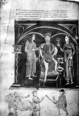 Credit: M0007390: Manuscript illustration from <i>Medicina Antiqua</i>, depicting use of medicinal draught. Source: Wellcome Collection.