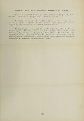 ![ABSTRACT FROM VITAL STATISTICS APPENDED TO REPORT. Infectious diseases notified during the year 1905:—Diphtheria;';; Erysipelas 23; Scarlet Fever 195; Enteric Fever 13; Puerperal Fever 4; Phthisis 21; total 2(51. Mortality from all causes during the year 1905, at subjoined ages : — Under one year, 93 ; one and under five, 43; five and under fifteen, 9; fifteen and under twenty-five, 16 ; twenty-five and under sixty-five, 92; sixty-five and upwards, 68 ; Deaths in public institutions, 36. Mortality during the year from subjoined causes :—Measles 18; Scarlet Fever 2 ; Whooping Cough 2; Diphtheria and Membranous Croup 5; Croup 1; Fever 2; Epidemic Influenza 3; Diarrhoea 14; Enteritis 2: Puerperal Fever 1; Erysipelas 3; Phthisis (Pulmonary Tuberculosis) 30; other Tubercular Diseases 15; Cancer, malignant disease 15; llronchitis 33 ; Pneumonia 6 ; Alcoholism, Cirrhosis of Liver, 4; Venereal diseases 2 ; Premature birth 20; Diseases and accidents of parturition 2; Heart diseases 18; Accidents 8 ; all other causes 115; total 321. [7]](https://iiif.wellcomecollection.org/image/b29743059_0013.jp2/full/800%2C/0/default.jpg)