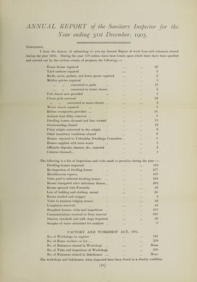 ![ANNUAL REPORT of the Sanitary Inspector for the Year ending 31 st December, 1905. Gentlemen, I have the honour of submitting to you my Annual Report of work done and nuisances abated during the year 1905. During the year 118 notices have been issued, upon which there have been specified and carried out by the various owners of property the following:— House drains repaired .. ... ... 36 Yard surfaces repaired . ... ... . 9 Roofs, eaves, gutters, and down spouts repaired ... . 2 Midden privies repaired .. ... ... ... 5 ., ,, converted to pails ... .. 17 ,, „ converted to water closets .. ... 6 Pail closets new provided . ... ... ... 5 Closet pails renewed ... ... ... .. 24 „ ,. converted to water closets .. ... ... 0 Water closets repaired ... ... ... .. 3 Refuse receptacles provided ... .. ... 24 Animals kept filthy removed .. .. .. ... 0 Dwelling houses cleansed and lime washed ... .. 13 Overcrowding abated ... .. . ... 13 Privy ashpits converted to dry ashpits ... ... ... 8 Other insanitary conditions abated ... ... ... 9 Houses reported to Unhealthy Dwellings Committee .. ... 0 Houses supplied with town water ... ... ... 6 Offensive deposits, manure, &c., removed ... ... 2 Cisterns cleansed... ... .. ... ... 1 The following is a list of inspections and visits made to premises during the year :— Dwelling-houses inspected ... ... ... ... 583 Re-inspection of dwelling houses ... ... .. 477 Miscellaneous reports .. ... ... 447 Visits paid to infected dwelling houses ... ... ... 432 Rooms fumigated after infectious disease... .. ... 264 Rooms sprayed with Formalin ... ... ... 56 Lots of bedding and clothing stoved ... ... 25 Rooms washed and stripped ... ... ... ... 0 Visits to common lodging houses ... ... 42 Complaints received ... ... ... ... 44 Slaughter-houses, visits and inspections ... ... .. 215 Communications received re Dust removal ... ... 247 Dairies, cowsheds and milk shops inspected ... ... 96 Samples of water submitted for analysis ... .. .. 8 FACTORY AND WORKSHOP ACT, 1901. No. of Workshops on register ... ... ... 147 No. of Home workers on list ... ... .. ... 256 No. of Nuisances abated in Workshops ... ... ... None No. of Visits and inspections of Workshops ... ... 250 No. of Nuisances abated in Bakehouses ... ... ... None The workshops and bakehouses when inspected have been found in a cleanly condition. [10]](https://iiif.wellcomecollection.org/image/b29743059_0019.jp2/full/800%2C/0/default.jpg)