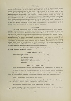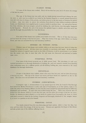 ![Borough of Loughborough. ANNUAL REPORT.7 of the Medical Officer of Health for the Year ending 31st December, 1905. Gentlemen, To the Council oj the Borough of Loughborough. I have the honour to present to you my Annual Report for the Year 1905. Area in Statute Acres 3045. Population (Census 1901) 21,508. Estimated to the middle of 1905, 22,832. Number of inhabited houses (estimated) 5190. Average number of persons per house 4-3. BIRTHS. The total number of births registered was 644, being 52 more than last year, and 44 above the average of the last 10 years, and is an annual birth-rate of 28-2 per thousand of the estimated population. MORTALITY. The total number of deaths registered was 337, but 18 of these were of persons not belonging to the Borough, who died at the Loughborough Workhouse or Hospital. By subtracting these and adding two deaths of Loughborough residents which occurred outside the Borough at the Isolation Hospital, we get the correct number of deaths of residents for the year which is 321, being 16 less than last year, and eight below the average of the last ten years, and is an annual death-rate of 14-0 per thousand. INFANT MORTALITY. The total number of deaths of infants under one year is 93. which is 10 more than last year, but is four below the average of the last ten years. This increased Infant Mortality is not accounted for as usual by Diarrhoea being prevalent, but is rather traceable to premature birth, and to the deaths of infants born in a feeble condition. The employment of women at laborious occupations during their pregnancy, and soon after their confinement is doubtless responsible for a considerable number of these deaths. The Infant Mortality rate for the year is 144 per thousand births registered, which, although higher than it ought to be, is 24 less than the average of the last ten years. ZYMOTIC MORTALITY. The total number of deaths from Zymotic Diseases, including Diarrhoea, is 47 which is six more than last year, and one below ihe average of the last ten years. This gives an annual Zymotic Mortality of 2-0 per thousand. INFECTIOUS DISEASES (NOTIFIED). The total number of cases of Infectious Diseases notified is 261 which is 272 less than last year, but is 66 above the average of the last ten years. The number of cases of the several diseases were as follows :— Scarlet Fever Diphtheria Typhoid Fever ... Puerperal Fever Erysipelas Phthisis 195 5 13 4 23 21 [1]](https://iiif.wellcomecollection.org/image/b29743059_0001.jp2/full/800%2C/0/default.jpg)