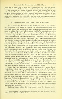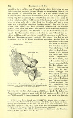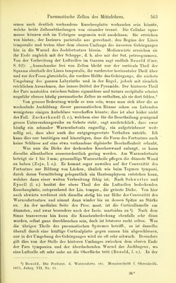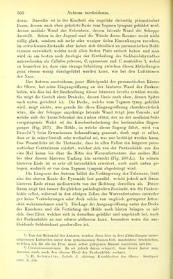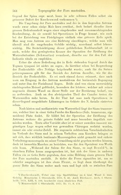 ![Gegend der Spina supr. meat. kann in sehr seltenen Fällen selbst ein grösserer Defect der Knochenwand vorkommen ]). Die Umgebung der Pars mastoidea und des in ihm liegenden Antrum wurde zwar schon einige Male kurz erwähnt, doch bedarf dieselbe ihrer grossen Bedeutsamkeit wegen einer eingehenden und zusammenhängenden Beschreibung, da sie sowohl bei Operationen in Frage kommt, wie auch bei der Entstehung von Fistelgängen vielfach eine grössere Rolle spielt. Man mag vom Antrum aus eine Richtung einschlagen, welche man will, überall sind die umgebenden Gebilde wichtig, manchmal selbst lebens- wichtig. Die Berücksichtigung dieser gefährlichen Nachbarschaft ist es auch, welche den gewiegtesten Kenner der Operation der Eröffnung des Warzenfortsatzes (Schwartze) veranlasst, dieselbe nur für den Fall der Indicatio vitalis zu empfehlen. Ueber die obere Bedeckung der in Rede stehenden Gegend durch das Tegmen tympani ist nichts zu sagen, da hierüber schon bei Besprechung der Paukenhöhle alles Nöthige beigebracht wurde; auch für die Sutura petro-squamosa gilt für das Bereich des Antrum dasselbe, wie für das Bereich der Paukenhöhle. Es sei noch einmal daran erinnert, dass nach vorn am Eingang in das Antrum mastoideum der horizontale Bogengang und unter ihm der Facialcanal liegen. Beide sind von einem unvorsichtig eindringenden Meissel gefährdet, besonders der letztere, welcher mit seiner ungemein dünnen Wand an dieser Stelle nur der Berührung bedarf, um zu zerbrechen. Auch an den absteigenden Theil des Canales treten die Warzenzellen nahe heran. In der That hat man nach Operationen in dieser Gegend ausgedehnte Lähmungen im Gebiete des N. facialis eintreten sehen. Nach hinten und medianwärts vom Warzentheil liegt der Sinus transver- sus, welcher hier in einer tiefen Furche des Knochens (Sulc. transversus, sig- moideus) Platz findet. Er bildet bei der Operation der Eröffnung des Antrums weitaus die grösste Gefahr und muss besonders ängstlich ver- mieden werden. Trotz aller Vorsicht aber ist er seiner zuweilen äusserst un- günstigen Lage wegen selbst von gewandten Chirurgen verletzt worden, immer ein sehr ernster Zufall. Die ungemein zahlreichen Verschiedenheiten im Verlaufe des Sinus und in seinem Verhalten zum Knochen bringen es mit sich, dass wirklich bestimmte Maassangaben nicht gemacht und sichere Verhaltungsmaassregeln zu seiner Vermeidung nicht gegeben werden können, doch ist immerhin Manches zu berichten, was für den Operateur von Werth sein kann. „Während der Sulcus für den Sinus, so sagt Bezold-2), in einzelnen Fällen kaum ausgesprochen ist, hat sich der Sinus in anderen Fällen ein so tiefes Bette gegraben, dass seine Höhlung einen grossen Theil der Pars mastoidea ausfüllt. Je tiefer die Fossa sigmoidea ist, um so schärfer umgebogen ist ihre obere Flexur, es liegt dann überhaupt das ganze Bette des Sinus weiter nach vorn und legt sich so zwischen Pars 2) Zuckerkandl, Ueber eine typ. Spaltbildung an d. hint. Wand d. äuss. Gehörg. Monatsschr. f. Ohrenheilk. 1878, S. 46. Auch Bürkner, Areh. f. Ohren- beilk. 1878, XIII, S. 189, beschreibt einen ähnlichen Fall. 2) Monatsschrift f. Ohrenheilk. 1873, Nr. 11, S. 134.](https://iiif.wellcomecollection.org/image/b20416301_001_0582.jp2/full/800%2C/0/default.jpg)