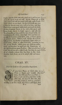![eth in the afpedt wea\ and ruffe, alfo the Hmgdrijh or XV. other weak Gold will not touch it felf right upon Touch. Seaion; Hotter which are too hard, for the Gold doth run over it, that the ftroak is not very well to be been, and that Touch~'slonc is not good which doth not touch the Gold, of what Contents foeyer it be, with a fine good and ftrongflroa\, that it be bright upon it, and alfo the Touch-needles as long untill the fame ftroak be like the Gold-ftroal\ in the colour, and as high: then you have ve¬ ry nigh the Content of the Gjold: only, as I have given an account above, Obferve well, whether the Gold be high -grain'd; viz. whether it hath much Copper added, or much white , which is called Pale Gold, according to gmjK this, ufe the Needier, which every one doth not under- ftand, and therefore he muft have the Knowledge of the righ jlroa\from great PrafJice. But as to the hard Concerning Gold, they do not give a rightflroa\, but they do touch brick] (Gold; all of a fmaller content than they have in fine Gold, therefore fuch ftroakf are to be judg’d falfe and uncer¬ tain* chap, xv Ho ip the Gold is to be -proved by Aqua fords. neceffity to ufe for a tryal, but if it is a cafl Ingot3 then Nn ' beat' bove* at one end of it, and below at the other end., and beat the Bits thin that you may weigh fo much as you have F you have fieces of Qold either in To cm Plates or Ingotts, and wouldft affay S. them, then firft cut Pieces or Plates a To cut pieces ftif](https://iiif.wellcomecollection.org/image/b30334056_0193.jp2/full/800%2C/0/default.jpg)