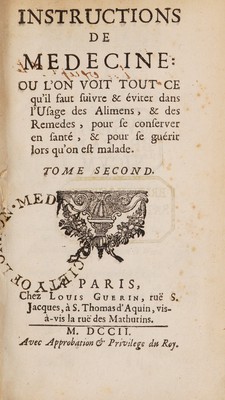 Instructions de medecine: ou l'on voit tout ce qu'il faut suivre et éviter dans l'usage des alimens, et des remedes, pour se conserver en santé, et pour se guérir lors qu'on est malade.