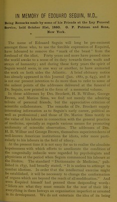In memory of Edouard Seguin, M.D. : a review of addresses at his funeral / by G.E. Shuttleworth.