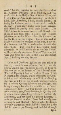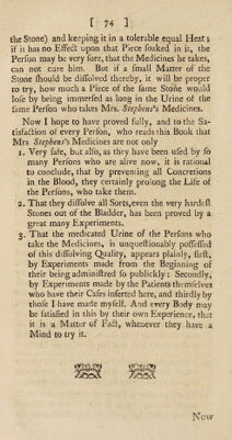 Credit: A treatise of the causes and symptoms of the stone; and of the chief remedies now in use to cure this distemper. Containing, a history of Mrs. Stephens's medicines, and her receipt. Observations upon them. Answers to the objections made against; and cautions to those who use them. An examination of lime-water and soap, and cases concerning them. Of Dr. Jurin's lithontripticum, or soap-lye; and remarks relating therunto. Of soap. Of the liquid shell, and other nostrums. Of forcing and softening remedies. Cases of persons who have taken Mrs. Stephens's preparation, in a solid form, with the sequel of a few printed before ... / By D., brother-in-law to Mrs. Stephens. Source: Wellcome Collection.