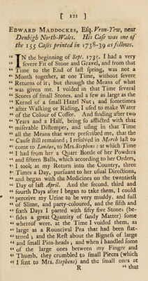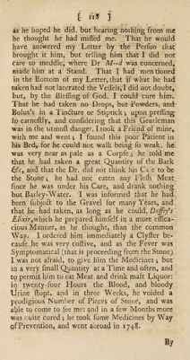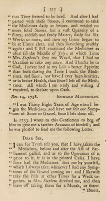 Credit: A treatise of the causes and symptoms of the stone; and of the chief remedies now in use to cure this distemper. Containing, a history of Mrs. Stephens's medicines, and her receipt. Observations upon them. Answers to the objections made against; and cautions to those who use them. An examination of lime-water and soap, and cases concerning them. Of Dr. Jurin's lithontripticum, or soap-lye; and remarks relating therunto. Of soap. Of the liquid shell, and other nostrums. Of forcing and softening remedies. Cases of persons who have taken Mrs. Stephens's preparation, in a solid form, with the sequel of a few printed before ... / By D., brother-in-law to Mrs. Stephens. Source: Wellcome Collection.
