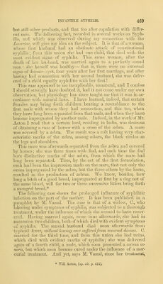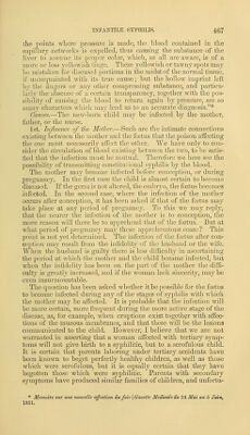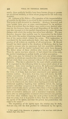 ![the woman C. has not ceased to enjoy good liealtli; sTie lias had no new symptom of venereal disease ; has communicated nothing to the men with whom she has had connection, and yet she has infected every child which she has brought forth, M. Cazenave, who has also reported this case, notes a circum- stance which can leave no doubt as to the nature of the accidents under which these children labored, viz., the second child infected its nurse. \ The most striking fact in this part of the etiology, is that of the transmissibility of syphilis to the germ by the semen, that is, by a product of secretion; a fact admitted by a partisan of the Hun- terian school, which denies the syphilitic alteration of the products of secretion ! Another important fact is the following, also ad- mitted M. Eicord, viz.: the mother who escaped syphilitic infec- tion after copulation with an individual laboring under the vene- real diathesis, this same mother who remained sound after impreg- nation, may become infected from the foetus, the germ of which has been contaminated by the semen of the same individual.* Thus, by an interchange facilitated by the circulation existing between the mother and, the foetus, when the latter is syphilitic, it may communicate the disease to the mother, as may the mother to the foetus, when she herself is infected. I beg the reader to pon- der over this fact of the ovum contaminated by the father, the mo- ther remaining at first sound, and afterwards to consider the fact of this mother who receives the infection from the child she carries in utero^ which child likewise contaminates its nurse; I beg the reader to follow the virus in its course, and afterwards tell me if it is in accordance with these facts and their philosophy to assert that the virus, when once the primary accidents have been de- stroyed, is impotent when removed from the person infected; that when once admitted to the circulation it is no longer capable of being transmitted! There is still another question. Both parents being sound, and having never suffered from syphilis before the mother be- came impregnated, when pregnancy once exists, can the ovum become infected through the influence of the father alone, who may have contracted the disease during the pregnancy of the mother ? This point has not yet been determined. The nega- tive may reasonably be inferred, and it is supposed that for the contamination of the ovum, the mother must first become infected. [Mr. Porter, in the Lecture from which we have already quoted, relates a case {Dub. Med. Press, Feb. 17, 1847, p. 100) which would seem to settle this question in the affirmative. The child was be- gotten three months before the father contracted the disease, the mother was sound, with the exception of some spots of button scurvy, yet the child, when born, was syphilitic.—G. C, B.] 3. Influence of the nurse upon the child, and vice versa, and upon those who have their earliest care.—The new-born child may receive * Vid. Acton, q;;. cit.](https://iiif.wellcomecollection.org/image/b21082340_0480.jp2/full/800%2C/0/default.jpg)