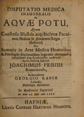 Disputatio medica inauguralis de aqvae potu, ... / subjicit Joachimus Frisius ... respondente Georgio Rasch ... Ad diem 28. Julii Anni 1680.