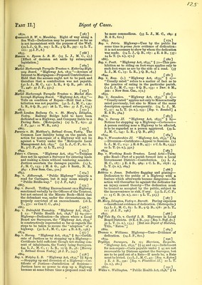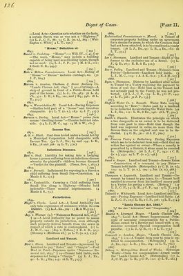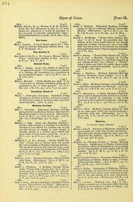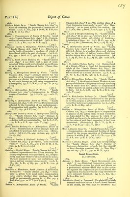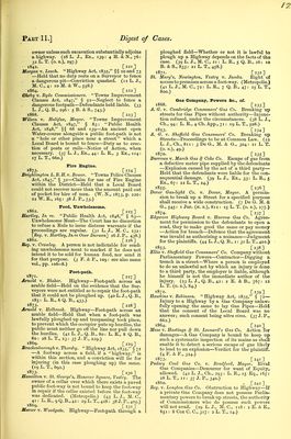 ![owner unless such excavation substantially adjoins a highway. (28 L. J., Ex., 139 : 4 H. & N., 76: 32 L. T. (o. s.), 297.) 1842. [221] Morgan v. Leach. Highway Act, 1835, §§20 and 73 —Held that no duty rests on a Surveyor to fence a dangerous pit—Conviction quashed. (12 L. J., M. C, 4: 10 M. &W., 558.) 1864. [222] Ohrby v. Byde Commissioners. Towns Improvement Clauses Act, 1847, § 5 2—Neglect to fence a dangerous footpath—Defendants held liable. (33 L. J., Q. B., 296: 5 B. & S., 743.) 1868. [223] Wilson V. Halifax, Mayor. Towns Improvement Clauses Act, 1847, § 83: Public Health Act, 1848, §§ 68 and 139—^An ancient open Water-course alongside a public foot-path is not a hole or other place near a street which a Local Board is boimd to fence—Duty as to erec- tion of posts or rails—Notice of Action, when necessary. (37 L. J., Ex., 44: L. E., 3 Ex., 114: 17 L. T., 660.) Fire Engine. 1873. [224] Drighlington L. B. H. v. Bower. Towns Police Clauses Act, 1847, § .S2—Claim for use of Eire Engine within the District—Held that a Local Board could not recover more than the amount paid out of pocket for hire of men. (W. N., 1873, p. 220 : 22 W. E., 165: 38 J. P., 73.) Pood, Unwholesome. 1862. [22s] Hartley, In re. PubUc Health Act, 1848, § 63— Unwholesome Meat—The Court has no discretion to refuse a Eule to issue distress warrants if the proceedings are regular. (31 L. J., M. C, 232: [Reg. V. Hartley,Inre Over Darwen'] 26 J. P., 438.) 1862. [ 226 ] Reg. V. Crawley. A person is not indictable for send- ing unwholesome meat to market if he does not intend it to be sold for human food, nor send it for that purpose. (3 E. & E., 109 : see also same vol., pp. io6~8.) Poot-path. 1871. [227] Arnold V. BlaTcer. Highway—Foot-path across an arable field—Held on the evidence that the Sur- veyors were not entitled so to repair the foot-path that it could not be ploughed up. (40 L. J., Q. B., i8s: L. E., 6 Q. B., 433.) 1873- [228] Arnold V. HolbrooTc. Highway—Foot-path across an arable field—Held that when a foot-path was lawfully ploughed up and trespassing took place, to prevent which the occupier puts up hm-dles, the public must neither go off the line nor pull down the hurdles. (42 L. J., Q. B., 80: L. E., 8 Q. B., 80: 28 L. T., 23: 37 J. P., 229.) 1869. [229] SracTcenhoroughv. Thorsby. Highway Act, 183:;, § 72 —A footway across a field, if a highway, is ■within this section, and a conviction will lie for injuring (in this case ploughing up) the same. (19 L. T., 692.) 187.^ [230] Samilion v. St. George's, Hanover Square, Vestry. The owner of a cellar over which there exists a paved public foot-way is not bound to keep the foot-way in repair if the cellar existed before the foot-way was dedicated. (Metropolis.) (43 L. J., M. C, 41: L.E., 9Q.B.,42: 29L.T.,428: 38 J. P., 405.) 1869. [231] ploughed field—Whether or not it is lawful to plough up a Highway depends on the facts of the case. (39 L. J., M. C, 21: L. E., 5 Q. B., 26: 10 B. &S., 833: 21L. T.,4S8.) 1871. _ [232] St. Mary's, Newington, Vestry v. Jacobs. Eight of access to premises across a foot-way. (Metropolis.) (41 L. J., M. C, 72 : L. E., 7 Q. B., 47 : 25 L. T., 800.) Gas Company, Powers &c., of. 1868. [233] A. G. V. Cambridge Consvmers' Gas Co. Breaking up streets for Gas Pipes without authority—Injunc- tion refused, imder the circumstances. (38 L. J., Ch., 94: L. E., 4 Ch. App., 71: 19 L. T., 508.) 1853- [234] A. G. V. Sheffield Gas Consumers' Co. Breaking up Streets—Proceedings to be at Common Law. (22 L. J., Ch., 811 : 3 De G., M. & G., 304: 21 L. T. (o. s.), 49.) 1870- [ 23s ] Burrows v. March Gas Coke Co. Escape of gas from a defective meter pipe supplied by the defendants —Explosion caused by the act of a third party— Held that the defendants were Kable for the con- sequential damage. (39 L. J., Ex., 33: L. E., 5 Ex., 67 : 22 L. T., 24.) i8SS- . [236] Dover Gas-light Co. v. Dover, Mayor. A permis- sion to break up a Street for a specified purpose shall receive a wide construction. (7 De G. M. & G., S4S: I Jur. (n. s.), 812 : 25 L. T. (o. s.), 277.) 1874- [237] Edgware Highway Board v. Harrow Gas Co. Agree- ment for permission to the defendants to open a, road, they to make good the same or pay money -—Action for breach—Defence that the agreement was invalid as authorising a nuisance—Judgment for the plaintiffs. (44 L. J., Q. B., i: 31 L. T., 402.) i8S3- [238] Ellis V. Sheffield Gas Consumers' Co. Company without Parliamentary Powers—Contractor—Digging a trench in a street—Where a person is employed to do an unlawful act by which an injury is done to a third party, the employer is liable, although he himseE is not the immediate author of the injury. (23 L. J., Q. B., 42 : 2 E. & B., 767 : 22 L. T. (o. s.), 84.) 1872. [239] Hawkins v. Bobinson. Highway Act, 1835, § 72— Injury to a Highway by a Gas Company unlaw- fully opening the same to lay Gas Pipes—Held that the consent of the Local Board was no answer; such consent being ultra vires. (37 J. P., 662.) 1864. [240] Mose V. Hastings Sf St. Leonard's Gas Co. Action for damages—A Gas Company is boirnd to keep up such a systematic inspection of its mains as shall enable it to detect a serious escape of gas likely to lead to an explosion—^Verdict for the plaintiff. (4 P. & F., 324.) 1873. C241] Pudsey Coal Gas Co. v. Bradford, Mayor. Eival Gas Companies—Demurrer for want of Equity, allowed. (42 L. J., Ch., 293 : L. E., 15 Eq., 167 : 28 L.T., 11: 37 J. P., 340.) i860. . [ 242 ] Beg. V. Longton Gas Co. Obstruction to Highway—If a private Gas Company does not possess Parlia- mentary powers to break up streets, the authority of Commissioners who do possess such powers win not avaU. (29 L. J., M. C, 118 : 2 E. & E.,](https://iiif.wellcomecollection.org/image/b20386643_0145.jp2/full/800%2C/0/default.jpg)