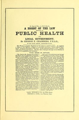 A digest of the law relating to public health and local government : with notes of 1073 leading cases, various official documents, precedents of by-laws and regulations, the statutes in full, a table of offences and punishments, ample indexes, &c / by George F. Chambers.