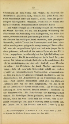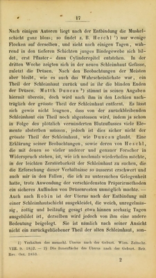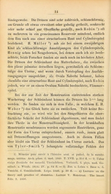 ![Anhang-. e r ]fl e II s c li. Die Schleimhaut der weiblichen Geschlechtstheile des Menschen bietet so viel Uebereinstimmendes mit der der eben betrachteten Säug-ethiere, dass ich unter Hinweisung- auf jene mich ziemlich kurz fassen kann, zumal auch die Lehrbücher der Anatomie und Histolog-ie diesen Gegenstand ausführlich behandeln. Es gilt diese Uebereinstimmung in hohem Grade für die Tuba, und nur ihre Drüsen verlangen eine kurze Besprechung. Schon Bowman 0 redet von Drüsen, ihre Anwesenheit wurde aber seitdem von den meisten Histologen geleugnet, bis vor Kurzem Hennig Beschreibung und Abbildung derselben geliefert, nach der sie den Tubadrüsen der Säugethiere dem gröberen wie dem feineren Bau nach ganz ähnlich sind. Wenn auch B 0 w m a n’s Beschreibung allerdings nicht ganz auf diese Drüsen passt, so behauptet Hennig doch wohl mit Unrecht, er habe sie gar nicht gesehen. Die Länge der Drüsen gibt Hennig auf 0,133 — 0,2375'^' bei einer Breite von 0,0418 — 0,057**’^ an. Ihre Darstellung gelang ihm auf die oben angeführte Weise (vermittelst Eisenchlorid). Auch bei Neugebornen vermochte ich sie schon deutlich zu sehen. Auf der sonst glatten Schleimhaut des Uterus werden von einigen Autoren Papillen angegeben, während andere, denen ich mich anschliesse, dieselben leugnen. Ihr Vorkommen be- schränkt sich wohl auf pathologische Zustände. Die Schleim- haut trägt ein cylindrisches Flimmerepitel ^), das im Mutter- halse durch flimmerloses Cylinderepitel in Pflasterepitel über- geht, und ist auch bei der Frau sehr reich an unentwickeltem 1) n. Todd, the Cyclopaedia of auat. and physiol. Lond. 1859. Vül. III. p. 497 art. mucous membran. — 2) Der Katarrh d. inn. weibl. Geschlechtsth. p. 3 ff -- 3) Bei Neugeborenen fand ich Cylinderepitel ohne Cilien.](https://iiif.wellcomecollection.org/image/b22308337_0013.jp2/full/800%2C/0/default.jpg)