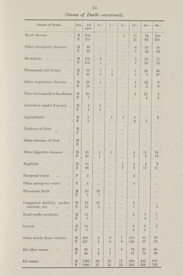 ![] 1 Causes of Death—continued. Causes of Death. Sex. All Ages. 0— 1— 5— 15— 45— 65— Heart disease M 304 .. .. 1 17 76 210 F 370 .. .. .. 21 *58 291 Other circulatory diseases M 46 .. .. .. 6 10 30 F 45 .. .. .. 1 12 32 Bronchitis M 133 6 .. .. 3 53 71 F 104 1 .. .. 1 28 74 Pneumonia (all forms) M 70 7 1 .. 7 21 34 F 45 5 2 .. 3 8 27 Other respiratory diseases M 26 1 .. .. 4 12 9 F 11 .. .. .. 1 5 5 Ulcer of stomach or duodenum M 35 .. .. .. 6 21 8 F 7 .. .. .. 4 3 Diarrhoea (under 2 years) M 4 4 .. .. .. .. .. F 4 4 .. .. .. .. .. Appendicitis M 8 .. 1 1 4 1 2 F 3 .. .. .. 2 .. Cirrhosis of liver M .. .. .. .. .. .. .. F .. .. .. .. .. .. .. Other diseases of liver M .. .. .. .. .. .. .. F .. .. .. .. .. .. .. Other digestive diseases M 28 1 1 .. 5 11 10 F 26 1 .. .. 1 5 19 Nephritis M 18 .. .. 1 4 4 9 F 28 .. .. 1 5 11 11 Puerperal sepsis F 2 .. .. .. 2 .. .. Other puerperal causes F 4 .. .. .. 4 .. .. Premature birth M 10 10 .. .. .. .. .. F 7 7 .. .. .. .. .. Congenital debility, malfor mations, etc. M 23 21 .. .. 2 .. 1 F 11 9 1 .. 1 Road traffic accidents M 15 .. .. .. 6 8 1 F 5 .. .. .. 4 1 Suicide M 14 .... .. .. 6 6 2 F 7 .. .. .. 2 5 .. Other deaths from violence.. M 250 3 6 7 110 85 39 F 297 4 8 9 136 87 53 All other causes M 85 1 1 5 12 20 46 F 68 3 1 14 14 36 All causes M 1398 59 12 17 256 442 612 F 1390 37 13 13 258 366 703](https://iiif.wellcomecollection.org/image/b19885635_0013.jp2/full/800%2C/0/default.jpg)