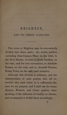 Brighton, and its three climates : with remarks on its medical topography, and advice and warnings to invalids and visitors / by A.L. Wigan.