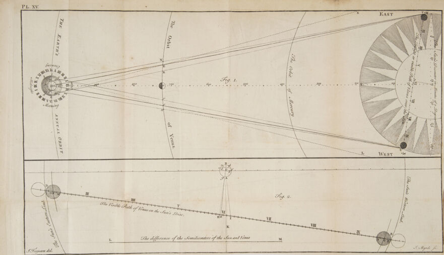 Credit: Astronomy explained upon Sir Isaac Newton's principles. And made easy to those who have not studied mathematics / To which are added, a plain method of finding the distances of all the planets from the sun, by the transit of Venus over the sun's disc, in the year 1761. An account of Mr. Horrox's observation of the transit of Venus in the year 1639; and, of the distances of all the planets from the sun, as deduced from observations of the transit in the year 1761. By James Ferguson. Source: Wellcome Collection.