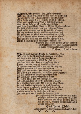 ![Spitn but r nteln pvtaDes ! DaS Dpffer reger ^BrufT, 0ie fc&lagt doU 3ardid)feit mtD trctbf Die fanfffc L?ujf °sh al!eu 9tOcrn forf. 3Dem 3iu&m unD ®lficEe grfinet\ 0?ein ‘Oalie jand^f &>ir $u, miesDu mti nttcl) oerDieuef. §j?id) nimt fetnfd)warger£ri<l> $u 0d)metd}eleoen ein, sftein! Dtefen flucte id>, id) branche Eeiuen 0ebein Cjniur ber gminbfd)afii ®iaui) De3 5$iffen$ SBerftjju fd)ifberm *bu fclbft beirabreftfeeb; toeg mif enfle&nfcn sBilbero. $amn qualte mtd) oor Dem gtebcr^ tabet ©cbmcvg, ^d) rief, &u famfi, id) fab $Dew 9JdttIa>b£ t>ofle$ *Derf), gm bofbeft mit Dte d>anD, unD balb enfflol) Dic 3$urDc, 5teunD, Da(j SDu toiebcr mctti unD id) Dev ©citte tiuirDe. g>ew ©luci i|i nteine 'iuji uuD ms nuta-5©]Snfc&cn n>arf @tdt fici) Mtnrae|r cvfulf init gvofjrer JSoffnung Dar. *£>tcrbuvd) trolie fcinctn toerifjen JreunDe W Der **'' langten ©octomfirbe fcincn crgcbenfien £Bunfd) abftatten, Dcffeibcn gcborfmnflev ©tener CoffarCj Nordhufanus. er 9lesf2fe$einD n>art>frnncF; Die i?tebc fur DaSLkbcn ^ Jj>ieg i§n Der 5icr(|fe ^unft geitottugen $u cr&cben. ©teSotben eilen furi Der ©ocior foiiu bercin, fbriuqt §frienet)en mif, er fcblttcFf ftc eiligji citu UuD fanm roatlt rciner 3Mut in Den gefanDen 2lbert?f 0o tvili er ura Den_&>bn mit Den 0aleuu3 baDcrn; n ©ocl/laftee \m Du rniif: ©n 33?atmDet unoerbrofen S)cr®iieberS5au burebfdjauf, Der ©affie, pulter, ©fkojjeu UnD tf>re $raffie meij?f Der jebe StrancFbeit Fennf, £>k Urfad), ipve Qlri unD ®egcnmtficl nennf, £)er in Dem 333iffen Deft, fart iebeS Slnfalis Iad)enf UnD $u SftetbuffliemS fid) unD Die 0d)tMd)ften mneben. ©em folgi Der ©eegen nad), Dem hleibt ein acbier tiubm, ©er mi$ §SerDien|f enifprtngi f ein ftete^ ©gentium. ©nmt 3mmo erimibe mir, Dnf; id) Duvd) &eine (gfyveu 2)ie2)m Detn^iei^ ertrarb Darfmeine JrcuDcnSbrni* 0o blube immerDar im3Btt.c&fc adjfer^reunD, U«D tVO^e 0rab unD XoD it)r fiegrdd)cr jeinD. «pierDtircDmokefeinem Do^uebrenDen unDmert^ geicDaiiten ^remiDe bci) ^rlangung Der Doctos tourDe grafuliren uno fid) ju geneiqfen 3inDen# cEen empfeblen, Deffelben aufrid)(ig ergebenjfer greunD unD ©tener Sati £uca$ aJiffilfr, mt5 ^SIcicberoDe in Deu ^obnfteinife&enfDer](https://iiif.wellcomecollection.org/image/b30782545_0044.jp2/full/800%2C/0/default.jpg)