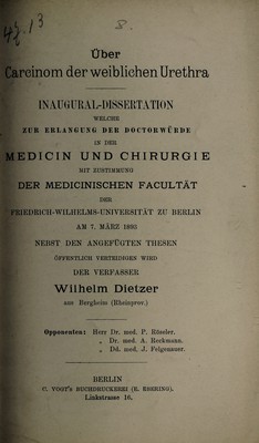 Über Carcinom der weiblichen Urethra ... / Wilhelm Dietzer.