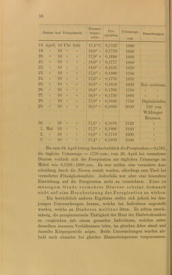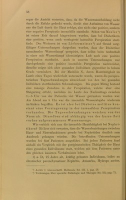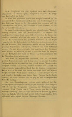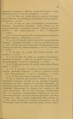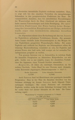 ![bei clii’onisclicr interstitieller Nephritis wiederum vermindert. Kurz, es zeigt sich bei den einzelnen Yersuclien ein unregelmässiges Scbwanken in den pers])iratoriscben Funktionen der Haut. Die voraussichtliche Annahme, dass bei unterdrückter Nierenthätigkeit der Wasserverlust durch die Haut vikariirend ein stärkerer wird, findet unseren Untersuchungen nach keine Destätigung. Die unter- drückten Funktionen der Niere hatten keine Steige- rung der insensiblen Perspiration zur Folge; mehrfach wurde sogar eine beträchtliche Abnahme derselben k 0 n s t a t i r t. Im Allgemeinen stimmt diese Beobachtung mit den von Janssen bei Nephritikern gefundenen Yerhältnissen überein. Der genannte Autor konnte ebenfalls keine Gesetzmässigkeit in den Mengen des von Nephritikern perspirirten Wasserdampfes finden. Bei acuter Nephritis und vielleicht bei Nephritis mit Schrumpfniere schien die wässerige Hautausdünstung vermindert zu sein, bei Nephritis und grossen Nieren aber bald mehr, bald weniger als bei normalen Yer- suchspersonen perspirirt zu werden. Yon grossem Interesse war es, festzustellen, in welchem Grade die insensible Perspiration an ödematösen Körpertheilen vor sich geht. Leider war es nur möglich, wegen der räumlichen Yerhält- nisse des Apparates, einen Yersuch hierüber anzustellen. Ruprecht, 46 Jahre alt, mächtiges Osteosarkom an der rechten Clavikula. Linke Hand bis zum Oberarm stark ödematös, rechte Extremität abgemagert; Zimmertemperatur = 16,4® C. Eeclite Extremität. Linke ödematöse Extremität. 0,1768 0,1940. Auch Janssen fand bei Hautödemen eine gesteigerte insensible Perspiration. Dass in der That die Zunahme derselben von den Oedemen abhängig ist, konnte Janssen durch folgende Unter- suchungen bestätigen: Bei einem Patienten mit chronischer Nephritis, welcher stetig die rechte Seitenlage bevorzugt hatte, war die rechte Seite viel stärker ödematös als die linke. Die Unter- suchung ergab: Wasserdampf in Grammen gesammelt in Va Stunde von 1000 qcm Haut vom recliten Arme. 0,412 0,399 0,447 vom linken Arme. 0,354’ 0,329 0,401](https://iiif.wellcomecollection.org/image/b21993956_0062.jp2/full/800%2C/0/default.jpg)