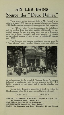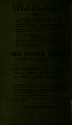 ![(SAVOIE.: i!V* ’• *jC*T ’'*^«u£i J^V ' -'■* « :'il‘IlW-J*T,T' ‘ •*>& Aix-les-Balns is one of the most anci< stations in the world and its . waters have famed for their curative effects in Rheumatisoi, Diabetes, Rheumatoid Arthritis (rheur™l4w Arthritis, Obesity, Syphilis, Neui various forms of Neuritis. £^4jX< sjjL ■ • i v t.s It is about half-wav between Paris ■ ■ ,'v. on the P.-L.M. Railway, close to the Bourget, in one of the nlost picture - Europe, a district of mountain, la1 between Switzerland and Italy. Upwards of a million gallons daily at a temj of 112° F. Pwl r- 1 >UCHE'MASSAGE (local ai LOCAL INTERNAL LAVAGE TREA* & The Bathing Establishment is State prop provided with every modern hydrotherapeuth iA highly trained staff of male and fema] lathing Season—April to September, Two Casinos, Theatre, Opera, Concert t,Altitude Stations: Mt. Revard (5,360 ft.). WiNTEt](https://iiif.wellcomecollection.org/image/b2809606x_0132.jp2/full/800%2C/0/default.jpg)
