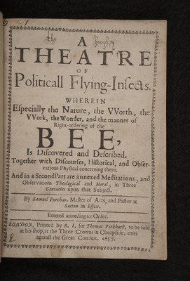 A theatre of politicall flying-insects. Wherein especially the nature, the worth, the work, the wonder, and the manner of right-ordering of the bee, is discovered and described / Together with discourses, historical, and observations physical concerning them. And in a second part are annexed meditations, and observations theological and moral, in three centuries upon that subject. By Samuel Purchase.
