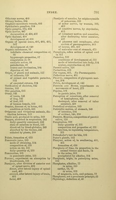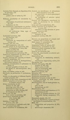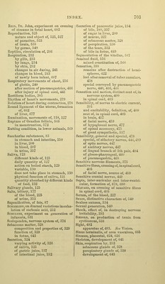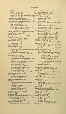 ![Smell, 488 ganglia of, 382, 489 nerves of, 446, 489 injured by division of 5tli pair, 454 Smith, Dr, Southwood, on cutaneous and pulmonary exhalation, 331 Solar plexus of sympathetic nerve, 516 Solid bodies, vision of with two eyes, 502 Sounds, of heart, 270 how produced, 271 vocal, how produced, 464 destroyed by section of inferior la- ryngeal nerves, 465 of spinal accessory, 475 Sounds, acute and grave, transmitted by membrana tympani, 508 Special senses, 478 Species, mode of continuation, 527 Spermatic iiuid, 556 mixed constitution of, 560 Spermatozoa, 556 movements of, 558 formation of, 559 Spina bifida, 641 Spinal accessory, 474 sensibility of, 475 communication of, with pneumogas- tric, 475 influence of, on larynx, 475 Spinal column, formation of, 591, 641 Spinal cord, 379, 398 commissures of, 381 anterior and posterior columns, 381 origin of nerves from, 380 sensibility and excitability of, 403 crossed action of, 404 reflex action of, 408 protective action of, 413, 414 influence on sphincters, 414 eff'ect of injury to, 414 on respiration, 441 formation of, in embryo, 591, 645 Spinal nerves, origin of, 380 Spleen, 208 Malpighian bodies of, 209 extirpation of, 211 Spontaneous generation, 527 Starch, 79 proportion of, in diflferent kinds of food, 80 varieties of, 80-82 reactions of, 82 action of saliva on, 129 digestion of, 150 Starfish, nervous system of, 373 Stercorine, 160 Stereoscope, 503 St. Martin, case of gastric fistula in, 135 Strabismus, after division of motor oculi communis, 451 of motor externus, 451 Striated bodies, 419 Sublingual gland, secretion of, 125 Submaxillary ganglion, 514 gland, secretion of, 125 Sudoriparous glands, 330 Sugar, 83 varieties of, 83 composition of, 84 tests for, 84 fermentation of, 85 proportion in different kinds of food, 86 source and destination, 86 produced in liver, 200 discharged by urine in disease, 357 Sugar in liver, formation of, 200 percentage of, 202 produced in hepatic tissue, 203 from glycogenic matter, 204 absorbed by hepatic blood, 206 decomposed in circulation, 206 Sulphates, alkaline, in urine, 353 Sulphur of the bile, 181 not discharged with the feces, 197 Swallowing, 131 retarded by suppression of saliva, 133 by division of pneumogastric, 463 Symj)athetic nerve, 514 its distribution, 515 sensibility and excitability of, 517 influence of, on special senses, 518 on pupil, 518 on nutrition of eyeball, 455 on nasal passages, 520 on ear, 520, 521 on temperature of particular parts, 521 reflex actions of, 524 Tadpole, development of, 592 transformation into fi'og, 594 Tffinia, 536 produced by metamorphosis of cys- ticercus, 538 single articulation of, 541 Tapeworm, 536 mode of generation, 537 Taste, 481 nerves of, 483 conditions of, 485 injury of, by paralysis of facial nerve, 487 Taurine, 181 Tauro-cholate of soda, 181 microscopic characters of, 179 Tauro-cholic acid, 181 Tears, 332 their function, 332 Teeth, of serpent, ] 21 of polar bear, 122 of horse, 122 of man, 123 first and second sets of, 689 Temperature of the blood, 254](https://iiif.wellcomecollection.org/image/b21224808_0690.jp2/full/800%2C/0/default.jpg)