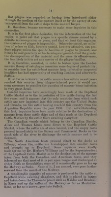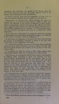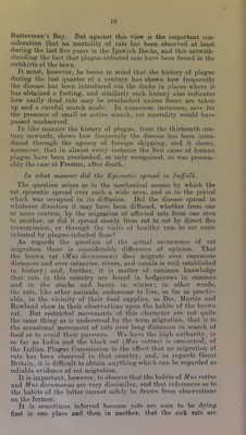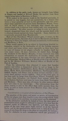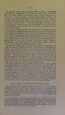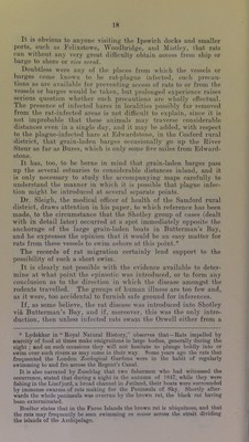 ![In addition to the direct Ipswich trade in grain, considerable quantities are discharged at Felixstowe Dock from the Black Sea, the River Plate, and Rosario, and it is of importance to note that a certain number of grain ships anchor annually oft' Shotley Point at the junction of the Orwell and Stour estuaries and there discharge their cargo, or such part of it as are destined for places in the vicinity. Some of it may go to Tiondon, some up the Orwell to Ipswich, up the Stour to Mistley, up the Deben to Woodbridge, and up the Alt to Orford, and some may go even further afield. It seems unnecessary to discuss this matter in further detail, as it is obvious from the foregoing facts that, as .some of these vessels come from ports which are now known to be plague-infected {i.e., certain Black Sea ports), and some come from ports which have been plague-infected within the last five years, there are, and have been, opportunities from time to time for the introduction of plague-infected rats into Ip.swich, Felixstowe Dock, Mistley, Woodbridge, and other pjaces at which grain-laden vessels or barges are accustomed to discharge their cargoes. Attention may be called to the fact that there are granaries and mills not only at Ipswich, but also at Felixstowe, Woodbridge, Mistley, and many other places, the grain being frequently con- veyed to the smaller ports by means of barges which have taken in their cargo either from some vessel or from the granaries at Ipswich. Reference must also be made to the fact that grain is not infrequently introduced into East Anglian ports from the London Docks, and it has to be realised that grain may be carried to the smaller ports by barges not only from Ipswich, Shotley, and Butterman’s Bay, but also from the London Docks. In other words, this barge traffic may ]>ossibly at times afford opportunities for the introduction of rats to the smaller ports. I am informed that rats are but rarely seen on these barges, and it would be easy to exaggerate risk in this sense. But, on the other hand, there can be no question that these barges do offer facilities for rat transference, and on making some inquiries at one of the smaller ports recently, I was informed that occasionally rats are seen on the barges, and that in one instance, what was apparently a black rat {Mns rattua), was caught on a grain barge alongside a wharf—the possible significance of which fact is obvious.* London Manure rn lirlntwn to the Rat Ejnzootic. At an early date in this investigation relative to rat plague, suggestions were made that the disease had been introduced into the Samford peninsula, and, possibly elsewhere, though the agency of manure from foreign cattle ships which discharge their cattle in the Thames, and, it was alleged, send their manure in barges to the Orwell. As an illustration of the conveyance of Mus rattus by vessels, it is recorded m the annual report of the Port Medical Officer of Health of Liverpool that during the year 1909 of 2,509 rats caught on board vessels or procured from the docks were examined, the majority belonged to Mus rattus. Of .S29 rats specially examined for the purpose of identification 229 belonged to Mus rattus. .*8 to Mas aleran/irhius and 2 to Mus vnrregirus. '](https://iiif.wellcomecollection.org/image/b24976775_0025.jp2/full/800%2C/0/default.jpg)