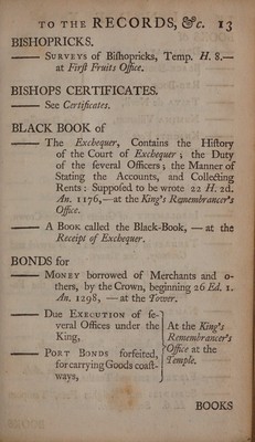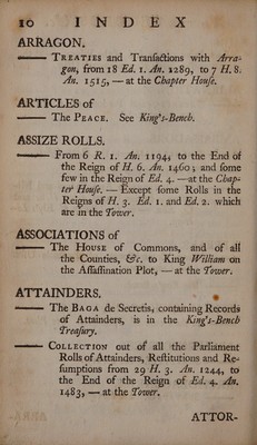 An index to the records : with directions to the several places where they are to be found. And ... explanations of the different kinds of rolls, writs, etc. To which is added, a list of the Latin sir-names, and names of places ... Also a chronological table ... shewing the several parliaments, and the different titles by which our kings are styled / [Anon.].