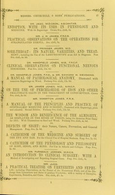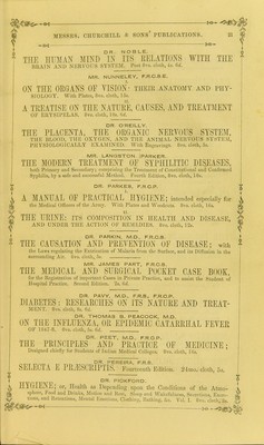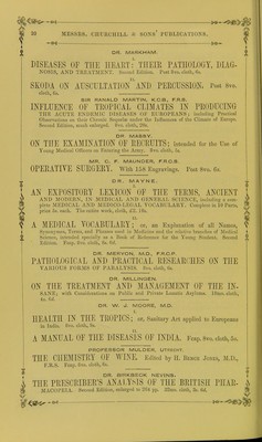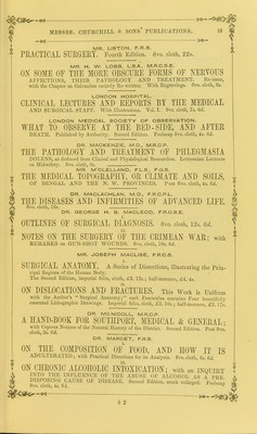 ![22 MESSRS. CIIURCniLL & SONS’ PUBLICATIONS. — Ot ]q> MR. PIRRIE, F.R.S.E. THE PRINCIPLES AND PRACTICE OE SURGERY. With numerous Engravings on Wood. Second Edition. 8vo. cloth, 24s. PHARMACOPOEIA COLLEGn~REGALIS MEDICORUM LON- DINENSIS. 8vo. cloth, 9s.; or 24mo. 5s. Imprimatur. Hie liber, cui titulus, Pharmaoopcbia Collegii Regalis Medicorum Londinensis. Datum ex iE dibus Collegii in comitiis censoriis, Novembris Mensis 14t0 1850. Johannes Ayrton Paris. Presses. f PROFESSORS PLATTNER & MUSPRATT. THE USE OE THE BLOWPIPE IN THE EXAMINATION OF MINERALS, ORES, AND OTHER METALLIC COMBINATIONS. Illustrated by numerous Engravings on Wood. Third Edition. 8vo. cloth, 10s. 6d. DR. HENRY F. A PRATT, M.D., M.R.C.P. THE GENEALOGY OE CREATION, newly Translated from the Unpointed Hebrew Text of the Book of Genesis, showing the General Scientific Accuracy of the Cosmogony of Moses and the Philosophy of Creation. 8vo. cloth, 14s. ON ECCENTRIC AND CENTRIC FORCE: a New Theory of Projection. With Engravings. 8vo. cloth, 10s. hi. ON ORBITAL MOTION: The Outlines of a System of Physical Astronomy. With Diagrams. 8vo. cloth, 7s. 6d. WAVtM\WtVWWuVVV\ THE PRESCRIBER’S PHARMACOPOEIA; containing all the Medi- cines in the British Pharmacopoeia, arranged in Classes according to their Action, with their Composition and Doses. By a Practising Physician. Fifth Edition. 32mo. cloth, 2s. 6d.; roan tuck (for the pocket), 3s. 6cl. 6 DR. PRIESTLEY. i LECTURES ON THE DEVELOPMENT OF THE GRAVID UTERUS. 8vo. cloth, 5s. 6</. DR. JOHN ROWLISON PRETTY. AIDS DURING LABOUR, including the Administration of Chloroform, the Management of Placenta and Post-partum Haemorrhage. Fcap. 8vo. cloth, 4s. 6d. MR. LAKE PRICE. PHOTOGRAPHIC MANIPULATION; Treating of the Practice of the Art, and its various appliances to Nature. With Fifty Engravings on Wood. Post 8 vo. cloth, 6s. 6d. „— MR P. C. PRICE, F.R.C.S.E. SCROFULOUS DISEASES OF THE EXTERNAL LYMPHATIC GLANDS: their Nature, Variety, and Treatment; with Remarks on the Management of Scrofulous Ulcerations, Scars, and Cicatrices. Post 8vo. cloth, 3s. 6d. THE WINTER CLIMATE OE MENTON, with hints to INVALIDS INTENDING TO RESIDE THERE. Fcap. 8vo. cloth, 3s.](https://iiif.wellcomecollection.org/image/b21309309_0408.jp2/full/800%2C/0/default.jpg)