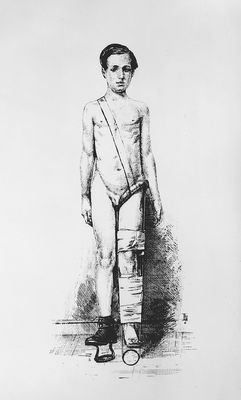Credit: M0019191: Illustration of Thomas's hip splint on a patient, with patten crutches. Source: Wellcome Collection.
