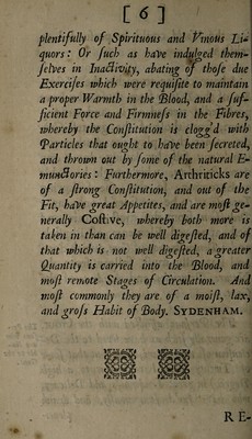 Credit: The nature, cause and symptoms of the gout: as stated by Dr. Sydenham, Cheyne, etc. from which is rationally deduced its direct and perfect cure / Gilbert Nelson. Source: Wellcome Collection.