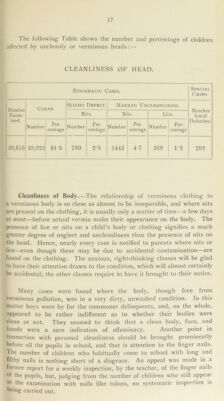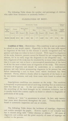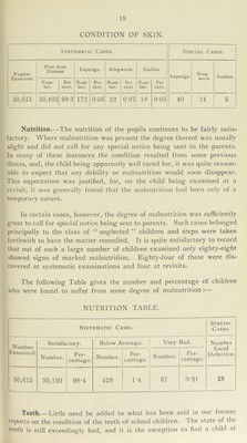 ![Condition of Skin. / Table E. NUMBER OF SCHOLARS EXAMINED AND THE NUMBER OF CONDITIONS RECORDED. SCHOLARS PRESENTING CONDITIONS OF WHICH THE PARENT® WERE NOTIFIED, AND THE NATURE OF THE CONDITIONS REQUIRING ATTENTION. SCHOLARS EXAMINED, Clothing and Footgear, Nutrition, Head, ] ?.its’ ( Lice, p ] f Nits, , Budy’ { Lice, 1 Dirty Body, Contagious Skin Diseases, < Ringworm l Scabies, . Decayed, ( Temporary, — — - - - l Permanent, 5 14 140 178 Nose and I : ,'7, Throat, 1 Arnolds,. (Lianas, External Eye Disease, Vision Distance Test, Squint, Ear Disease, Wax, ... Hearing, Speech, Mental Condition, f {M‘> { Deficient, Heart and Circulation, Lungs, Nervous fEpilepsy, ... Disease, l„01ea> [Paralysis, .. Tuberculosis,| Osseous,dly’ Rickets, ,Glandular- Deformities, Infectious Disease, ^ Other Diseases or Defects,](https://iiif.wellcomecollection.org/image/b28658619_0027.jp2/full/800%2C/0/default.jpg)