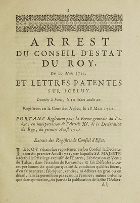 Arrest ... du 10 mars 1722 et lettres patentes ... Portant reglement pour la ferme generale du tabac ... Registrées ... 28 mars 1722.