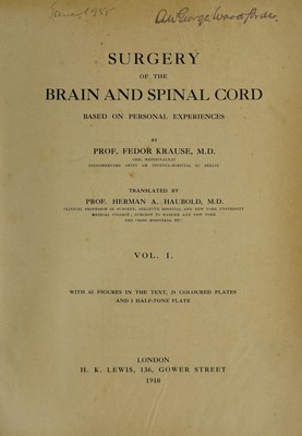 Surgery of the brain and spinal cord : based on personal experiences / by Fedor Krause ; English adaptation by Max Thorek.