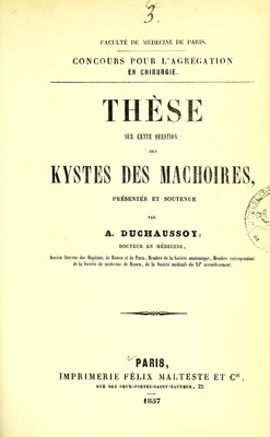 Thèse sur cette question : des kystes des mâchoires / présentée et soutenue par A. Duchaussoy.