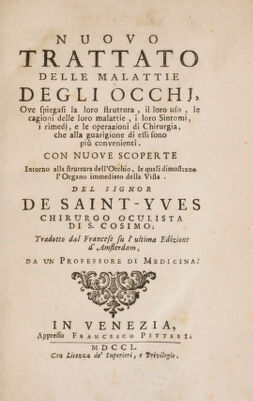 Credit: Nuovo trattato delle malattie degli occhi : ove spiegasi la loro struttura, il loro uso, le cagioni delle loro malattie, i loro sintomi, i rimedi, e le operazioni di chirurgia, che alla guarigione di essi sono più convenienti. Con nuove scoperte intorno alla struttura dell'occhio, le quali dimostrano l'organo immediato della vista / ... Tradotto dal francese su l'ultima edizione d'Amsterdam, da un professore di medicina. Source: Wellcome Collection.