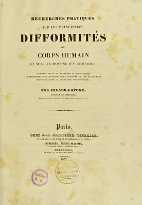 Recherches pratiques sur les principales difformités du corps humain, et sur les moyens d'y remédier / [G. Jalade-Lafond].