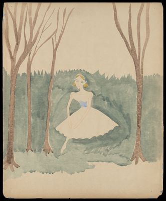 Credit: A woman in a corseted dress between brown trees on a green ground. Source: Wellcome Collection.