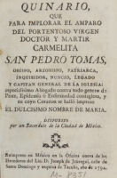 Quinario, que para implorar el amparo del portentoso virgen, doctor y martir carmelita San Pedro Tomas ... : especialisimo abogado contra todo genero de peste, epidemia, ô enfermedad contagiosa ... / dispuesto por un sacerdote de la ciudad de México. Public Domain Mark. Source: Wellcome Collection.