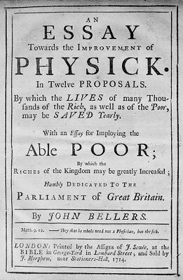 Credit: M0013795: Bellers: <i>An Essay Towards the Improvement of Physick</i>, 1714: title page. Source: Wellcome Collection.