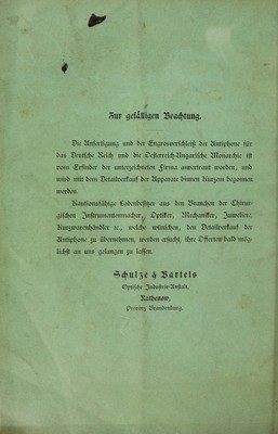 ![* * i Sur gefälligen £ead)tung. Die Anfertigung unb ber <£ngrost>erfchlei§ bet Antiphone für bas Dcutfdje Heid) unb bie 0eftm*eid^Uugarifd)e ATonarcbie ift Dom (Erfinber ber unterjeichneten ^irma anuertraut worben, unb \ wirb mit bem Detaiberfauf ber Apparate binnen Kurjem begonnen werben. l\autiousfäl]ige £abenbefi£er aus ben Branchen ber €l)irur^ giften 3nftrumentenmacher, £)ptifer, Aicdjanifer, 3uweliere, Aurjwarenhänbler ic., welcpe wünfehen, bett Detaiberfauf ber Antiphone 5U übernehmen, werben erfudjt, ihre Offerten halb mög= lichft an uns gelangen 511 taffen, Stf)Ul3e Sf 25artel0 0ptifd)c 3nbuftrie'21rtftalt. Ivütbfiuntv prorim Brandenburg.](https://iiif.wellcomecollection.org/image/b22468262_0054.jp2/full/800%2C/0/default.jpg)