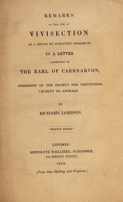 ![REMARKS ON THE USE OF VIVISECTION AS A MEANS OF SCIENTIFIC RESEARCH; IN A LETTER ADDRESSED TO THE EARL OF CAERNARVON, PRESIDENT OF THE SOCIETY FOR PREVENTING CRUELTY TO ANIMALS, BY RICHARD JAMESON, “RESPITE FINEM.” LONDON: HIPPOLYTE BAILLljfeRE, PUBLISHER, 219, REGENT STREET. 1844. [Price One Shilling and Sixpence.]](https://iiif.wellcomecollection.org/image/b30361515_0001.jp2/full/800%2C/0/default.jpg)