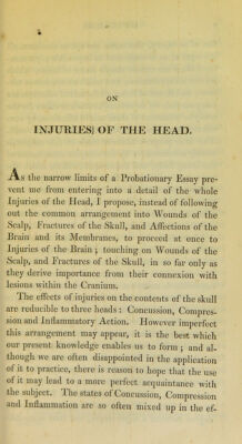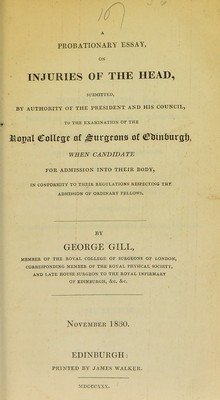 A probationary essay on injuries of the head : submitted, by authority of the President and his Council, to the examination of the Royal College of Surgeons of Edinburgh, when candidate for admission into their body, in conformity to their regulations respecting the admission of ordinary Fellows / by George Gill.