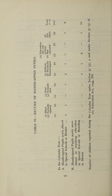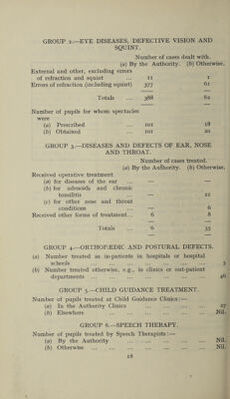 ![B.— CLASSIFICATION OF THE GENERAL CONDITION OF PUPILS INSPECTED DURING THE YEAR IN THE AGE GROUPS. Age Groups (1) Number of Pupils Inspected (2) A (good) % of No. col. 2 (3) B (fair) %of No. col. 2 (4) C (poor) %of No. col. 2 (5) Entrants 1037 686 66.2 330 31.8 21 2.0 2nd Age Group 747 494 66.1 248 33-2 5 0.7 3rd Age Group 457 314 00 140 30.6 3 0.7 Other periodic inspections 56 42 75*o 14 25.0 — — Total 2297 1536 66.9 732 3i-9 29 1.2 TABLE III INFESTATION WITH VERMIN. (i) Total number of examinations in the schools by the school nurses or other authorised persons ... ... 22,254 (ii) Total number of individual pupils found to be infested 168 (iii) Number of individual pupils in respect of whom cleansing notices were issued (Section 54 [2], Education Act, 1944) .. . 7 (iv) Number of individual pupils in respect of whom cleansing orders were issued (Section 54 [3], Education Act, I944) . 4 TABLE IV TREATMENT TABLES. GROUP 1.—DISEASES OF THE SKIN (excluding Uncleanliness, for which see Table III). Number of cases treated or under treatment during the year. {a) By the Authority. (b) Otherwise. Ringworm—(a) Scalp ... — _ (b) Body ... 3 _ Scabies ... 2 _ Impetigo ... ! _ Other skin diseases ... g 3 Totals ... 15 3](https://iiif.wellcomecollection.org/image/b30267080_0019.jp2/full/800%2C/0/default.jpg)